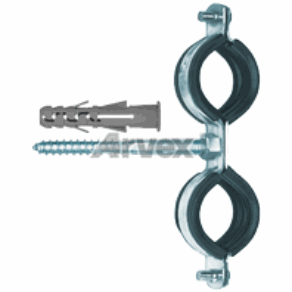 – podwójna obejma do rur z uszczelką i dyblem stalowa obejma zaciskowa do rur z gumową uszczelką, podwójna, komplet z wkrętem dwugwintowym i kołkiem rozporowym, wzmocniona konstrukcja skręcana dwiema śrubami, gniazdo z gwintem metrycznym M8