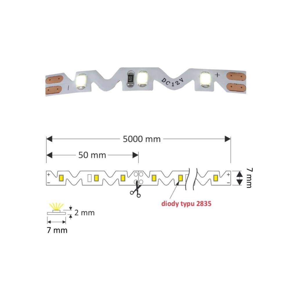 Rolka taśmy o długości 5 m i szerokości 7 mm jest bez żelu, ze standardowym stopniem ochronności IP20. Moc taśmy to 4,5W/0,5 m (9W/m). Jeden moduł taśmy ma długość 5 cm, zawiera 3 nowoczesne diody LED typu 2835. Taśmę można ciąć co 5 cm na odcinki o dowolnej długości.