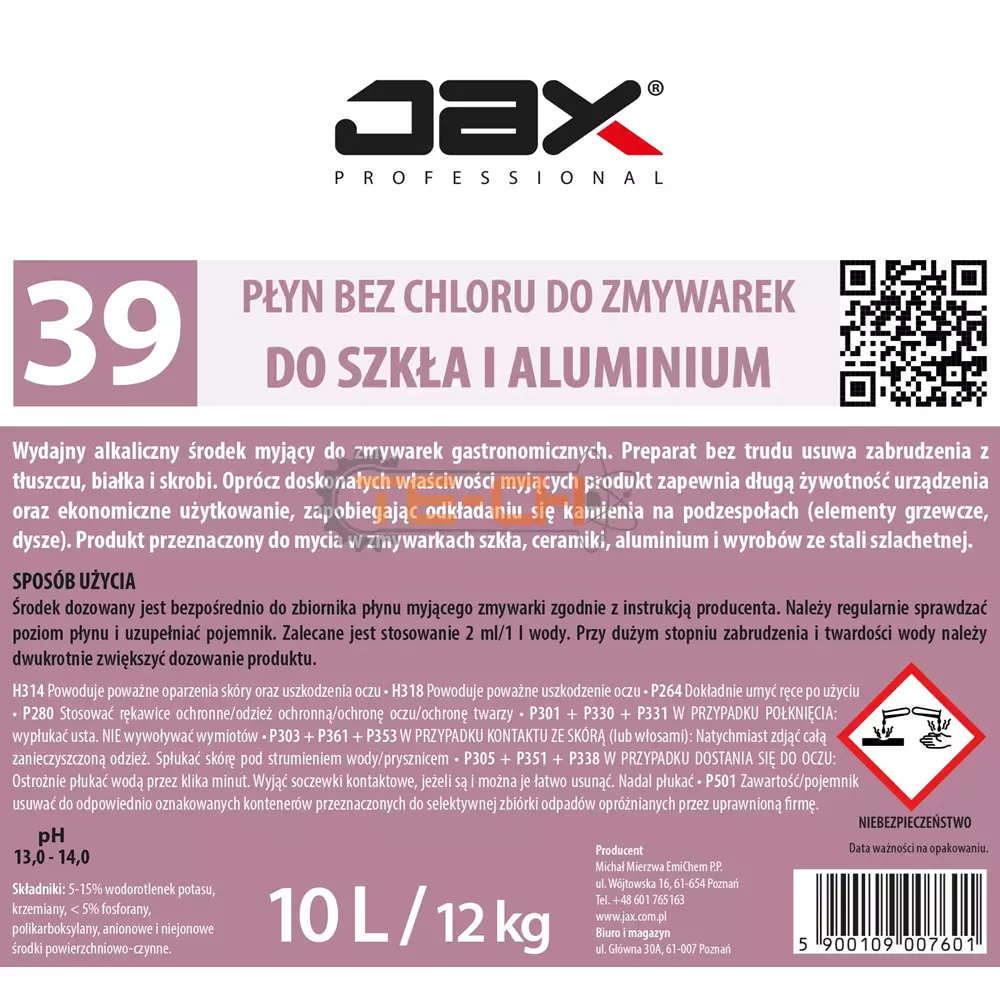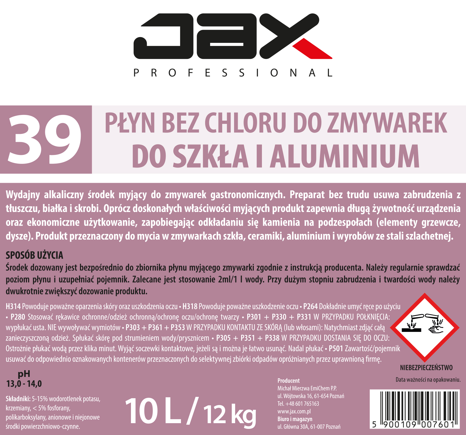 JAX PROFESSIONAL 39 10L – PŁYN MYJĄCY BEZ CHLORU DO ZMYWAREK, DO SZKŁA I ALUMINIUM do mycia zabrudzeń z tłuszczu, białka, skrobi