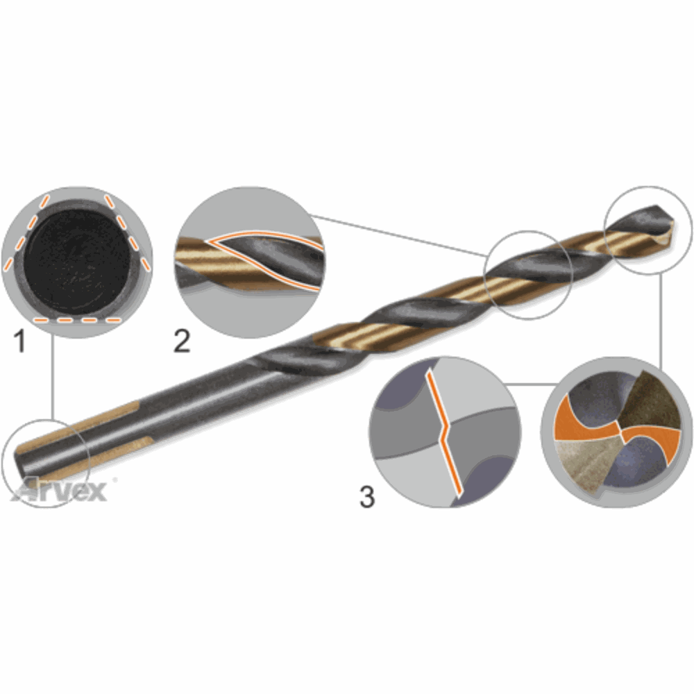 Profesjonalne wiertło do metalu wykonane techniką szlifowania zgodnie z normą DIN 338; prawoskrętny rowek spiralny, wierzchołkowy kąt nachylenia ostrza 135°, uchwyt walcowy z trzema płaskimi ścięciami (w przypadku wierteł o średnicy od 5mm lub walcowy w przypadku mniejszych średnic).