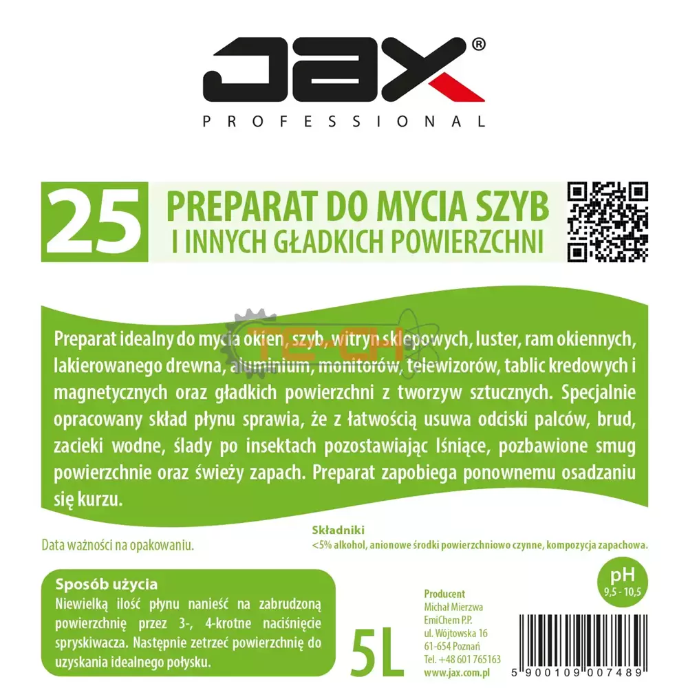 JAX PROFESSIONAL 25 – PŁYN DO MYCIA SZYB I INNYCH GŁADKICH POWIERZCHNI ŚRODEK DO MYCIA OKIEN, SZYB,SZKŁA, LUSTER, DO CZYSZCZENIA ALUMINIUM, CZYSZCZENIA MONITORÓW, TELEWIZORÓW, LAKIEROWANEGO DREWNA, USUWA ODCISKI ŚLADY PALCÓW