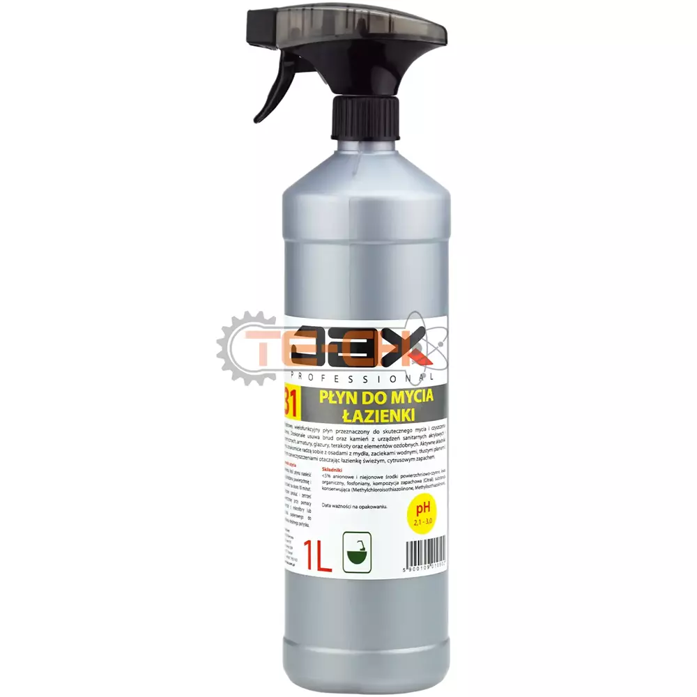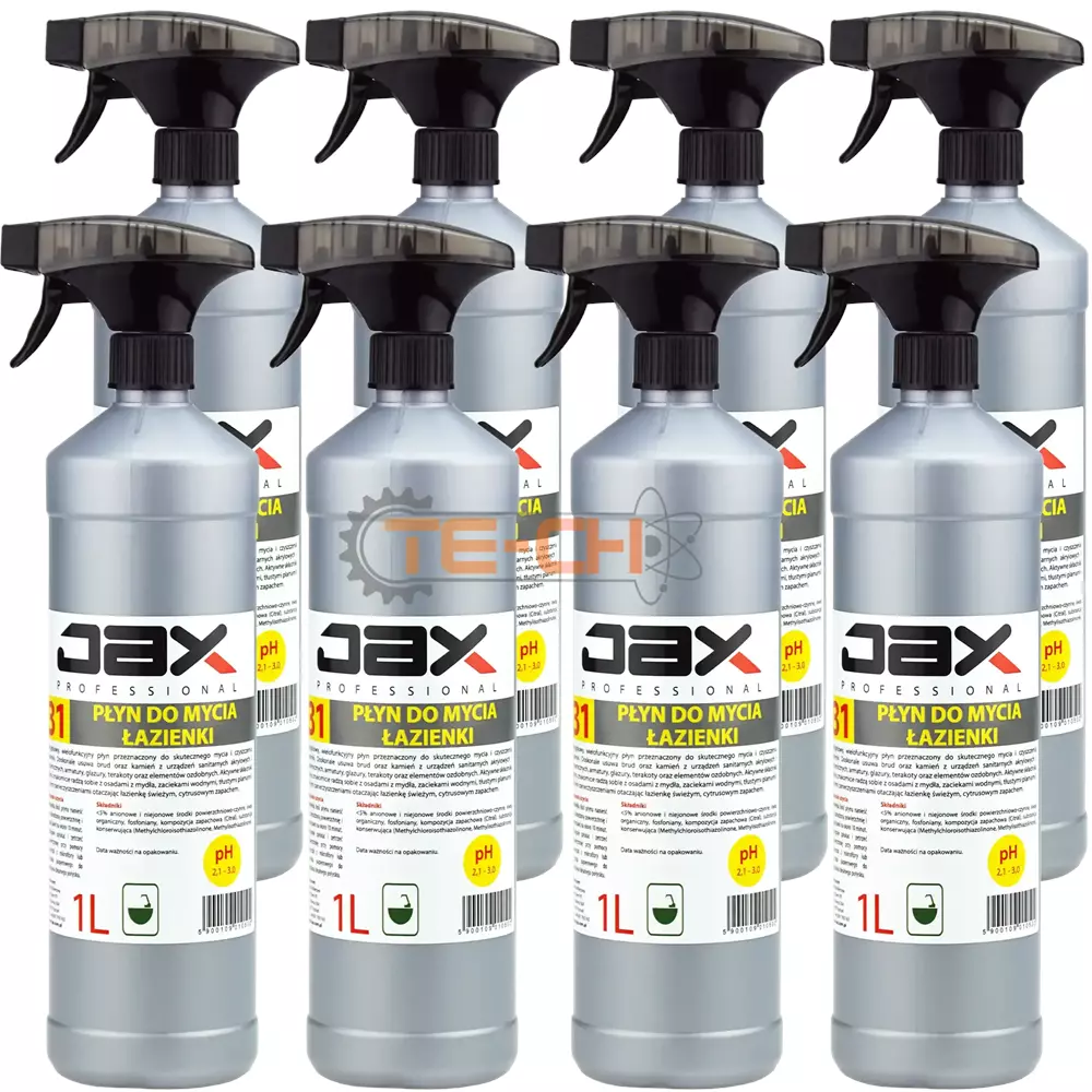 JAX PROFESSIONAL 31 – PŁYN DO MYCIA I PIELĘGNACJI ŁAZIENKI USUWA OSADY Z MYDŁA I KAMIENIA, ZAPOBIEGA OSADZANIU SIĘ ZABRUDZEŃ, DO KABIN PRYSZNICOWYCH, BATERII, GLAZURY, CERAMIKI, TERAKOTY I ALUMINIUM