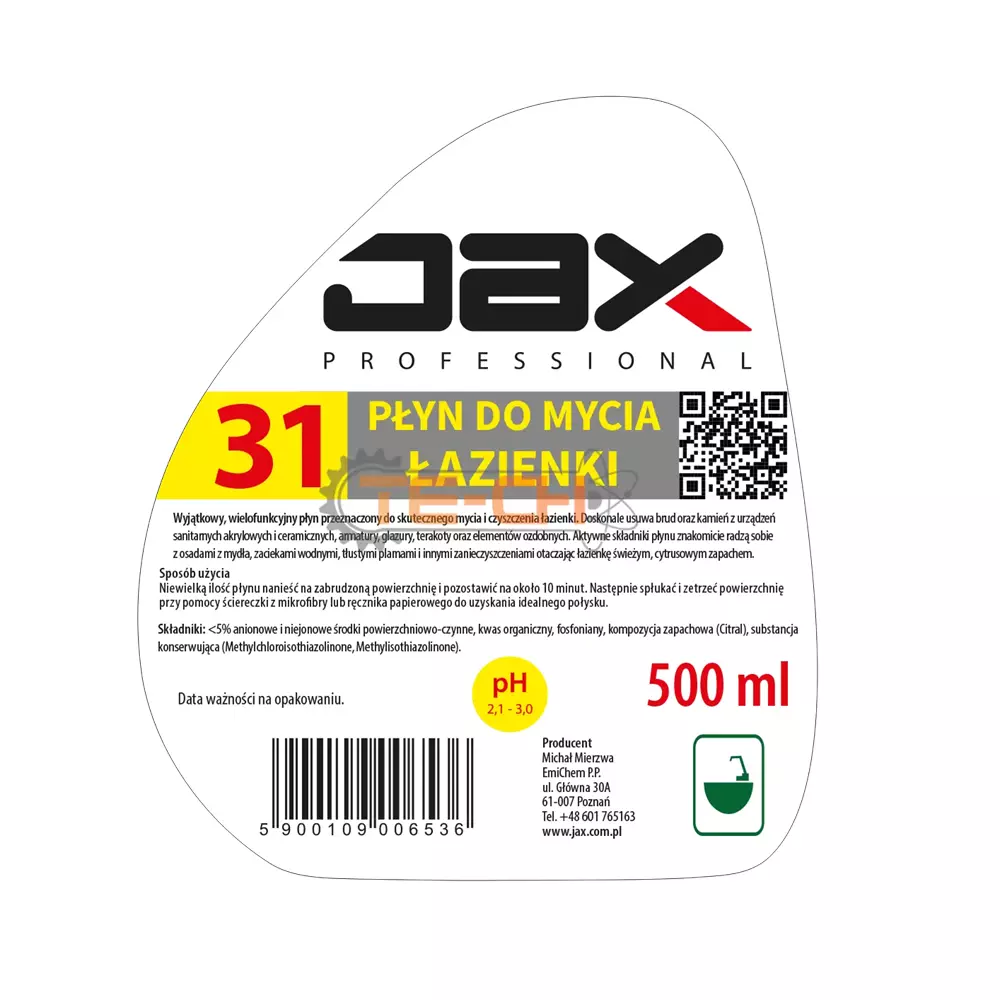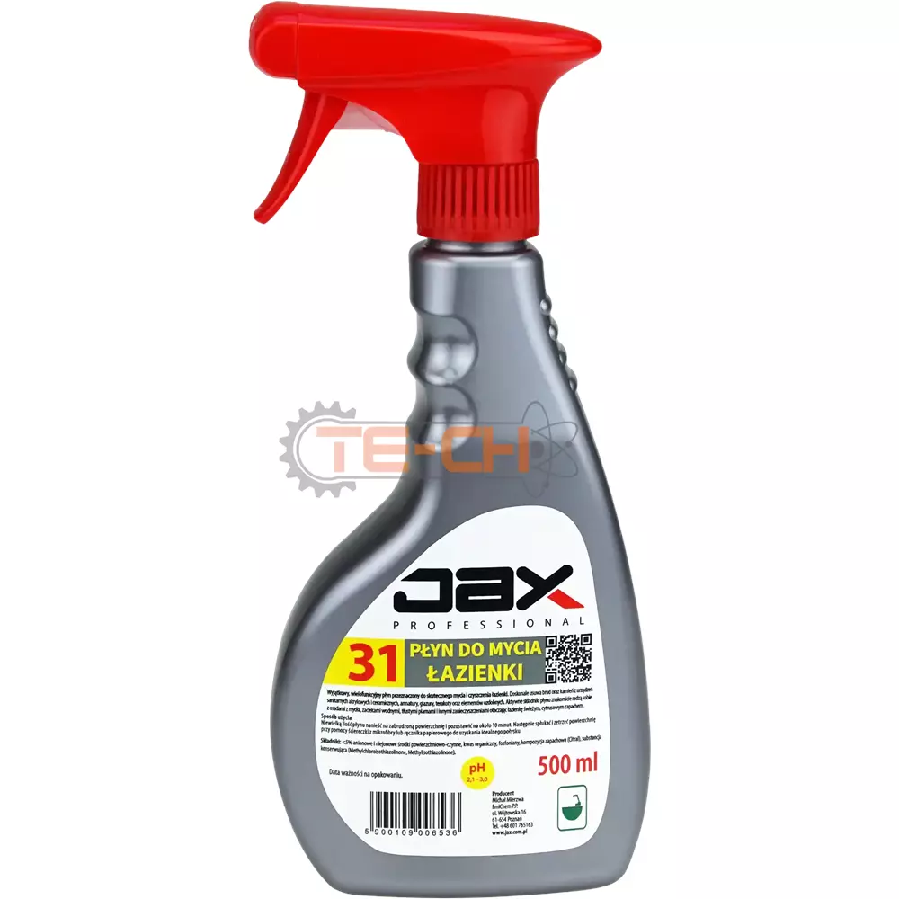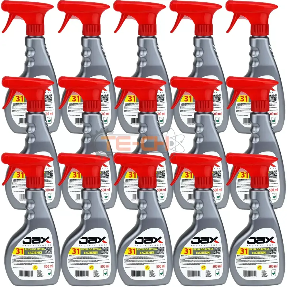 JAX PROFESSIONAL 31 – PŁYN DO MYCIA I PIELĘGNACJI ŁAZIENKI USUWA OSADY Z MYDŁA I KAMIENIA, ZAPOBIEGA OSADZANIU SIĘ ZABRUDZEŃ, DO KABIN PRYSZNICOWYCH, BATERII, GLAZURY, CERAMIKI, TERAKOTY I ALUMINIUM