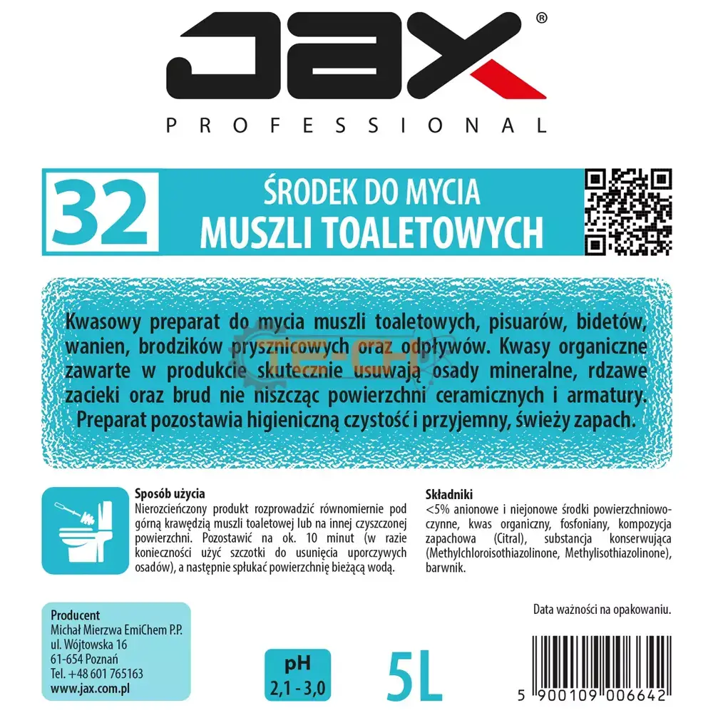JAX PROFESSIONAL 32 – PŁYN DO MYCIA MUSZLI TOALETOWYCH PISUARÓW, DO CZYSZCZENIA MYCIA BIDETÓW, WANIEN, BRODZIKÓW PRYSZNICOWYCH, ODPŁYWÓW, USUWA BRUD, KAMIEŃ, OSADY MINERALNE I RDZAWE ZACIEKI