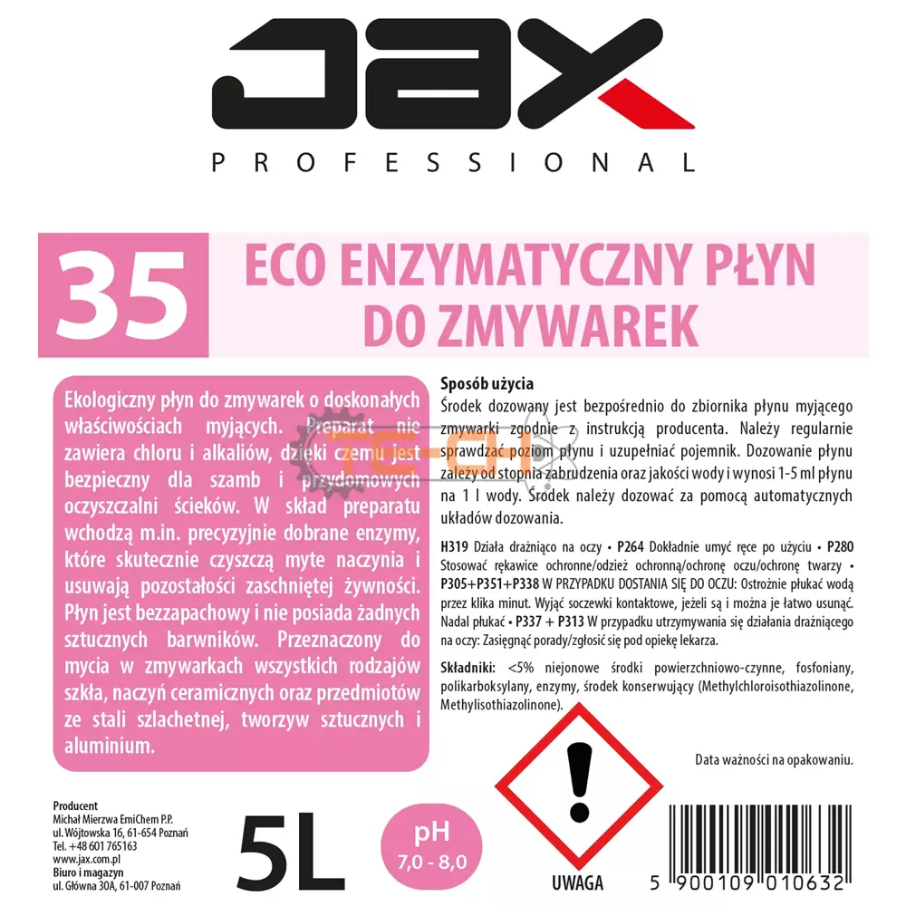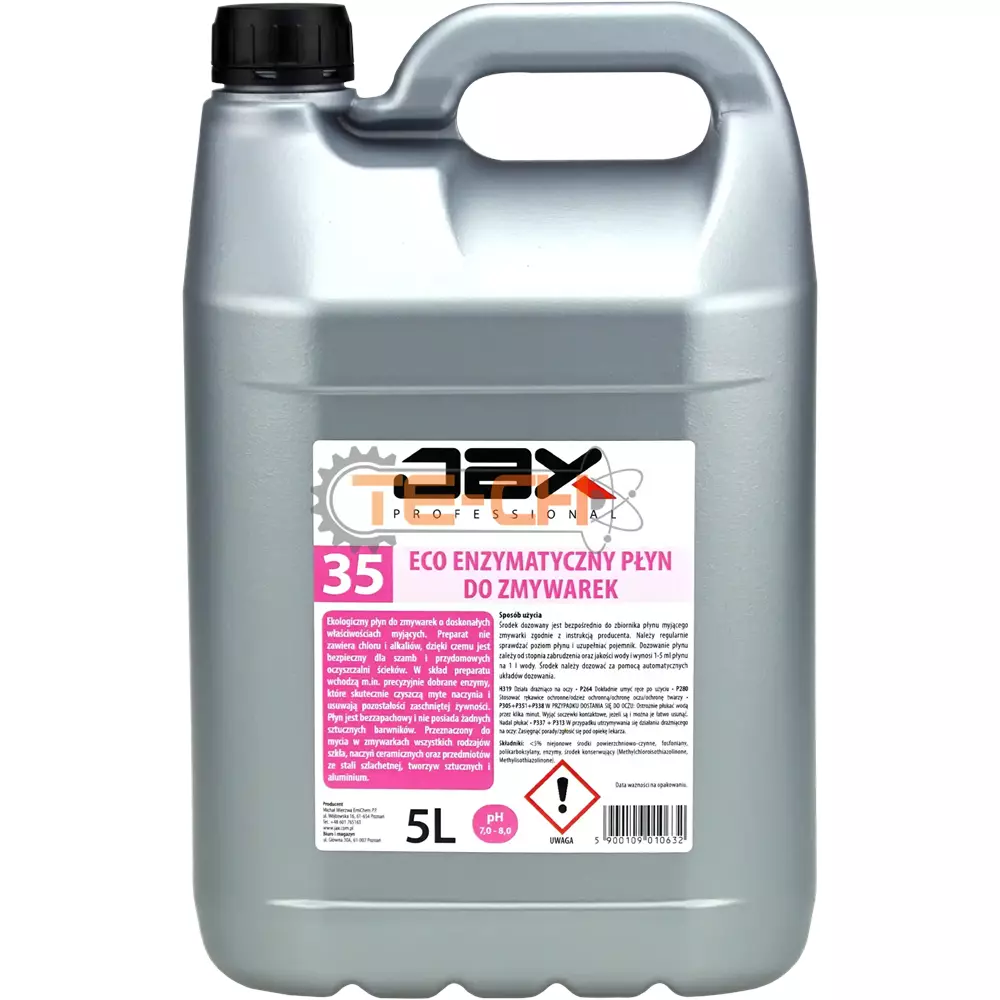 JAX PROFESSIONAL 35 – ECO ENZYMATYCZNY PŁYN DO ZMYWAREK DO MYCIA SZKŁA, NACZYŃ CERAMICZNYCH, MYCIA PRZEDMIOTÓW ZE STALI SZLACHETNEJ ALUMINIUM I TWORZYW SZTUCZNYCH