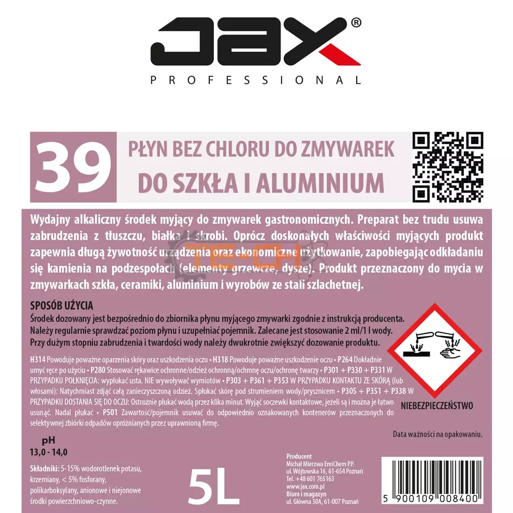 JAX PROFESSIONAL 39 – PŁYN MYJĄCY BEZ CHLORU DO ZMYWAREK, DO SZKŁA I ALUMINIUM DO MYCIA ZABRUDZEŃ Z TŁUSZCZU, BIAŁKA, SKROBI