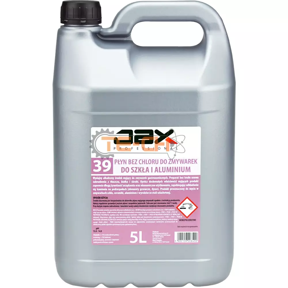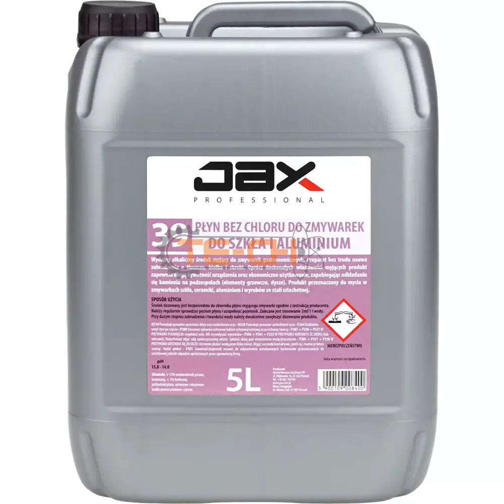 JAX PROFESSIONAL 39 – PŁYN MYJĄCY BEZ CHLORU DO ZMYWAREK, DO SZKŁA I ALUMINIUM DO MYCIA ZABRUDZEŃ Z TŁUSZCZU, BIAŁKA, SKROBI
