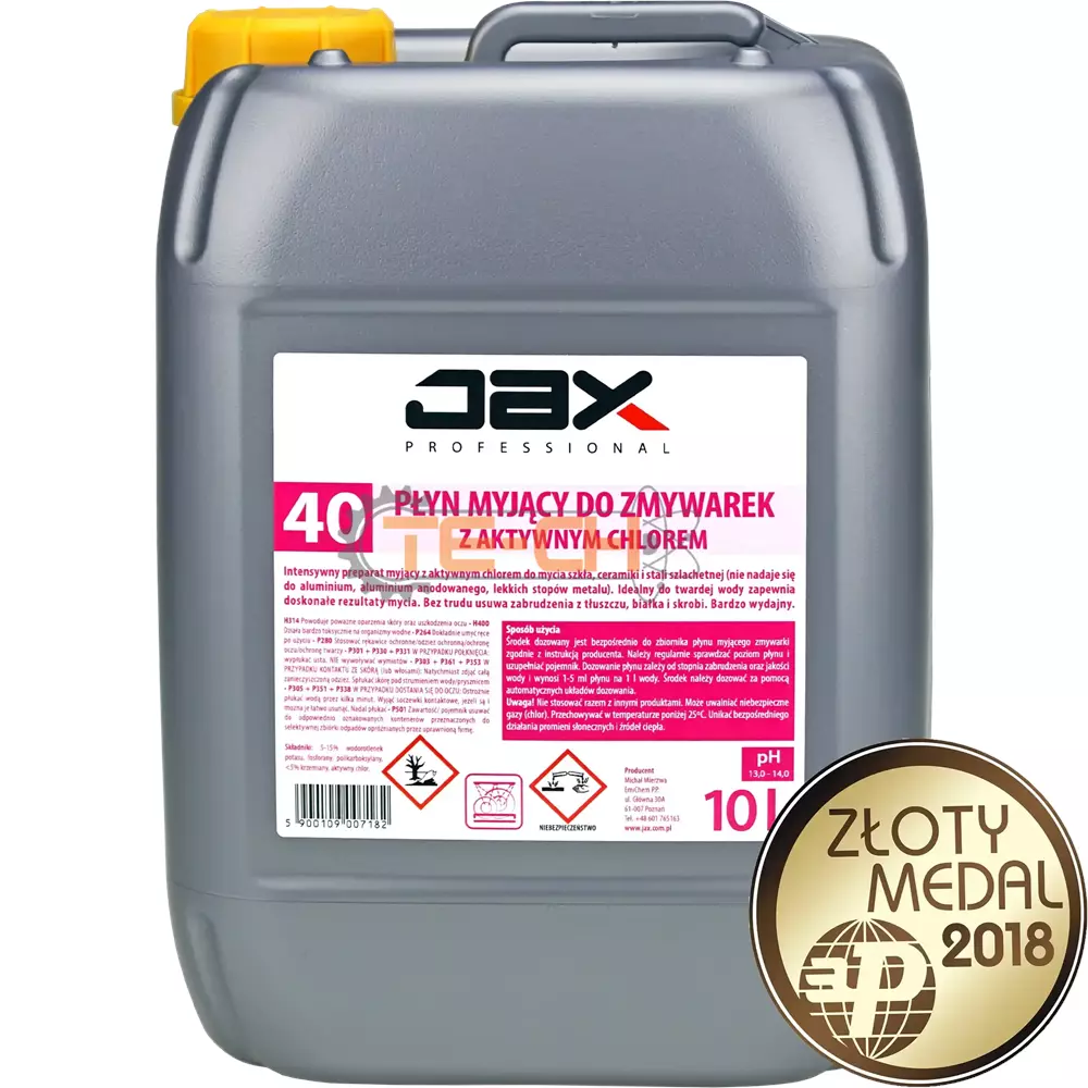 JAX PROFESSIONAL 40 – PŁYN DO MASZYNOWEGO MYCIA NACZYŃ, ZAWIERA AKTYWNY CHLOR, PŁYN Z CHLOREM DO MYCIA SZKŁA, CERAMIKI, STALI SZLACHETNEJ, USUWA OSADY PO KAWIE I HERBACIE