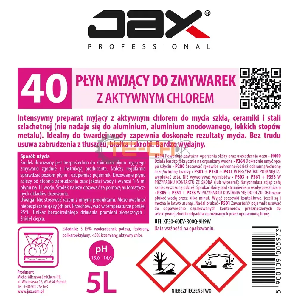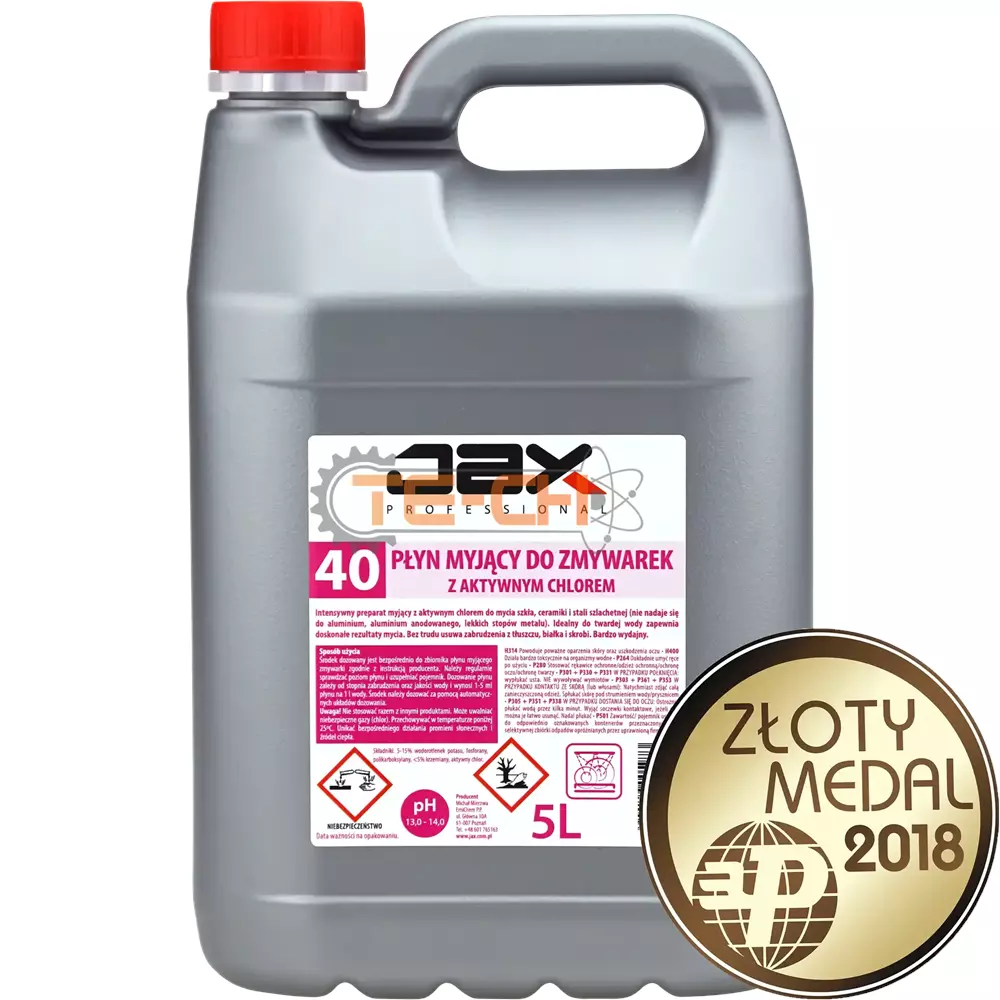 JAX PROFESSIONAL 40 – PŁYN DO MASZYNOWEGO MYCIA NACZYŃ, ZAWIERA AKTYWNY CHLOR, PŁYN Z CHLOREM DO MYCIA SZKŁA, CERAMIKI, STALI SZLACHETNEJ, USUWA OSADY PO KAWIE I HERBACIE