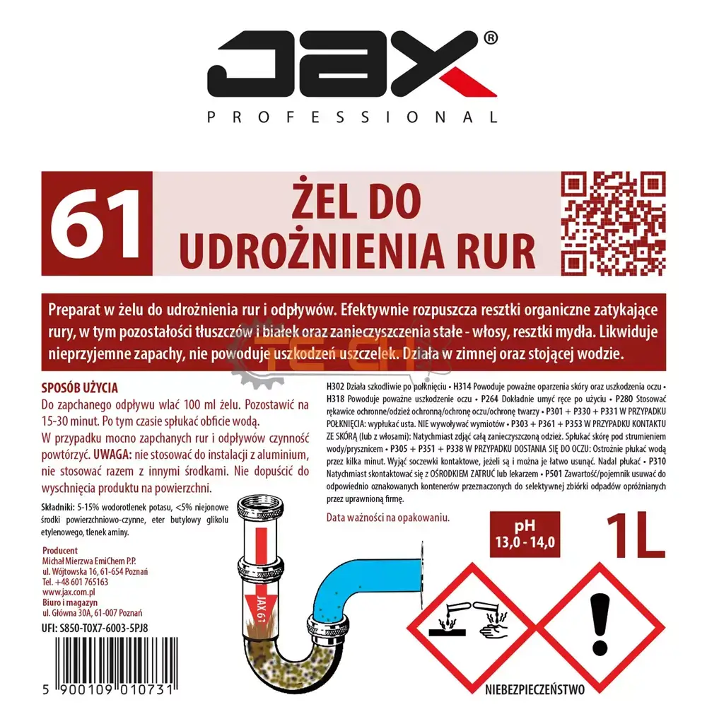 JAX PROFESSIONAL 61 – ŻEL DO UDROŻNIENIA RUR DO PRZECZYSZCZANIA ZAPCHANYCH ODPŁYWÓW, DO ZLEWÓW