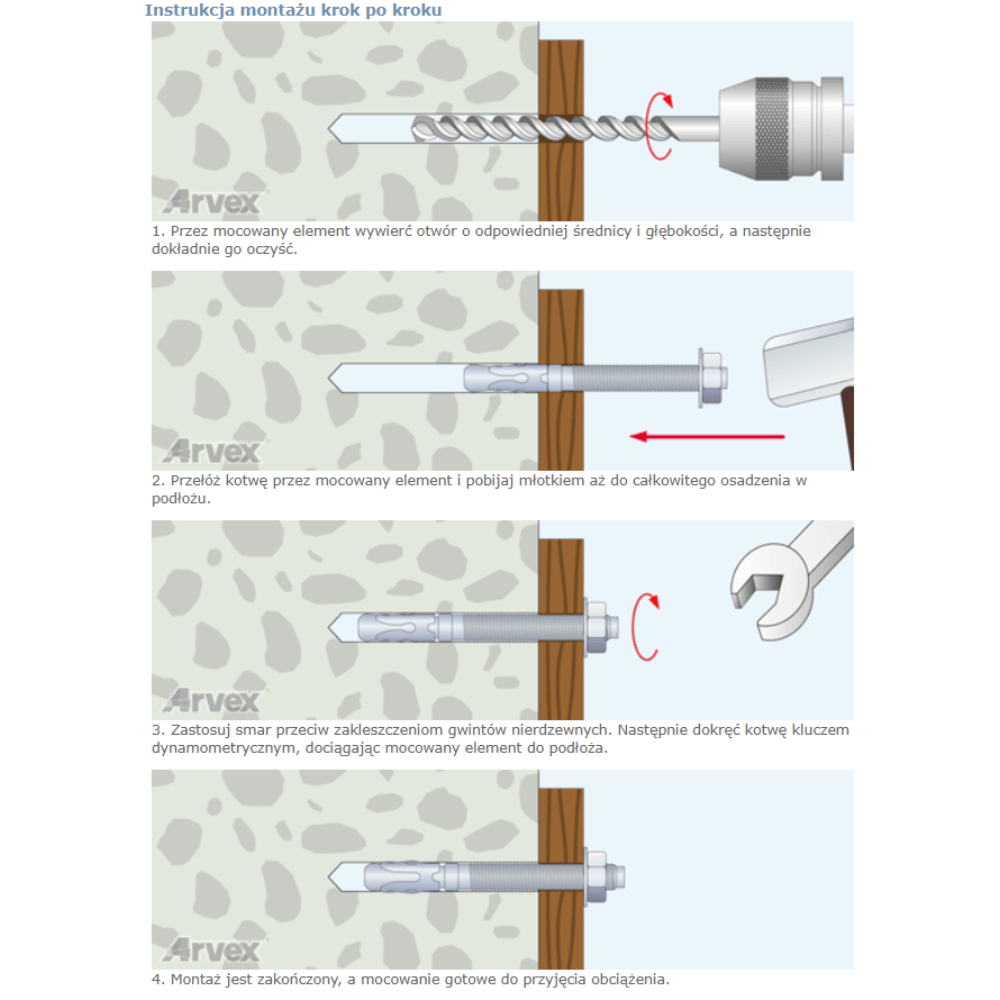 - kotwy wykonane ze stali nierdzewnej wymagają skutecznego smarowania – w przeciwnym wypadku gwinty mogą ulec zatarciu,