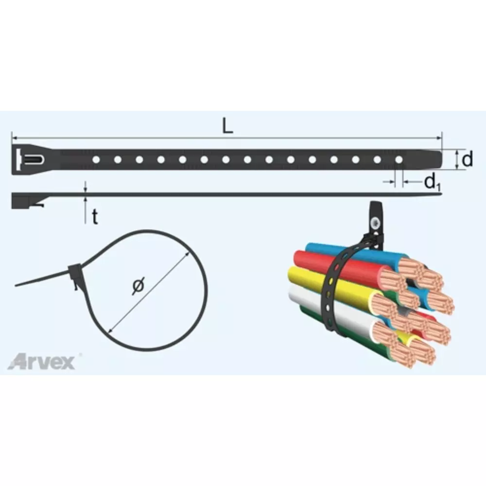 | - | Najczęstsze zastosowania: związywanie przewodów elektrycznych lub lin, podwieszanie kabli do ścian czy sufitów, mocowanie rur i drutów, itp. |