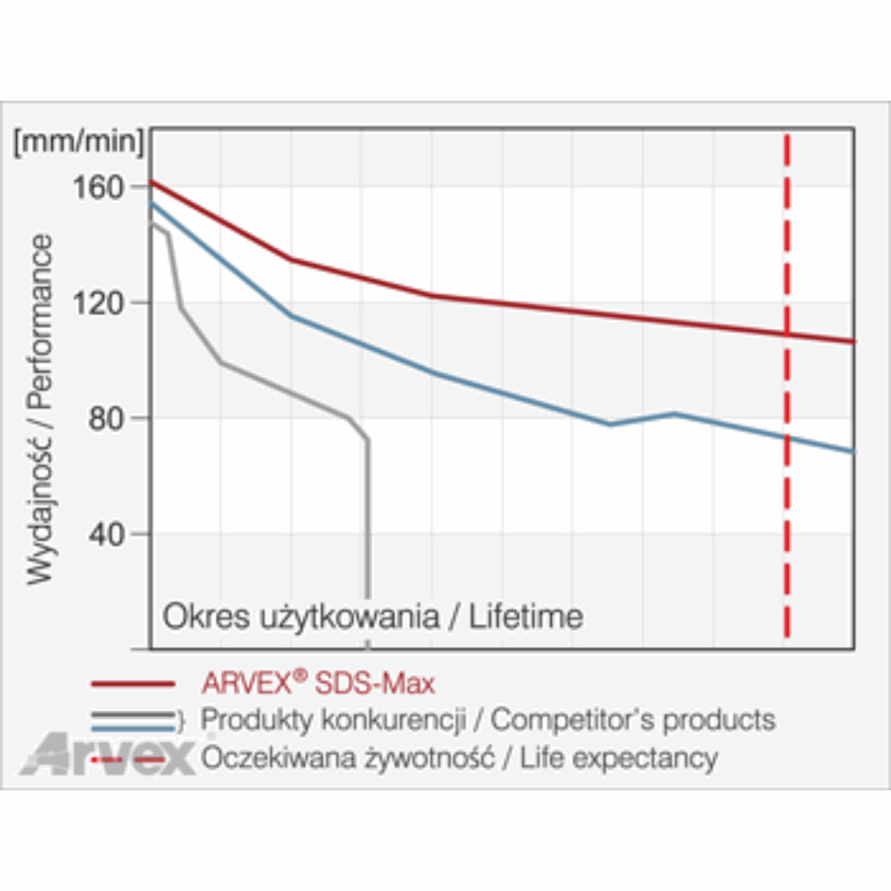 Ponadto nieustannie prowadzony jest program badawczy oparty na wynikach testów praktycznych, który zmierza do dalszej poprawy wydajności. W rezultacie wiertła SDS-MAX firmy ARVEX® są w stanie sprostać wciąż rosnącym wymaganiom rynkowym.