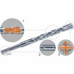 -geometria głowicy 4×90° zapewnia precyzyjne otwory przez cały czas użytkowania wiertła,