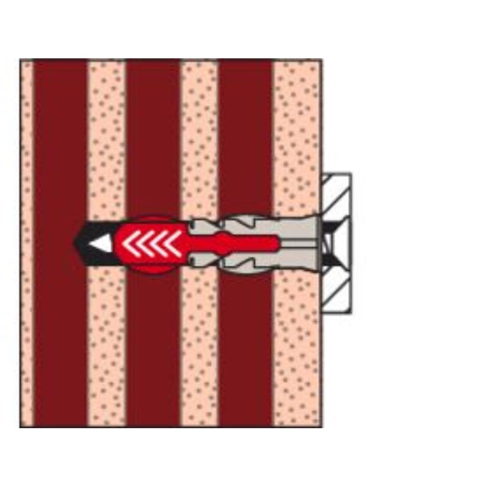 - Zwiększona głębokość kotwienia, w przypadku kołków DuoPower 6 x 50, 8 x 65 oraz 10 x 80 oznacza, że kołek szczególnie dobrze nadaje się do mocowania w pustakach, gazobetonie oraz w ścianach otynkowanych.