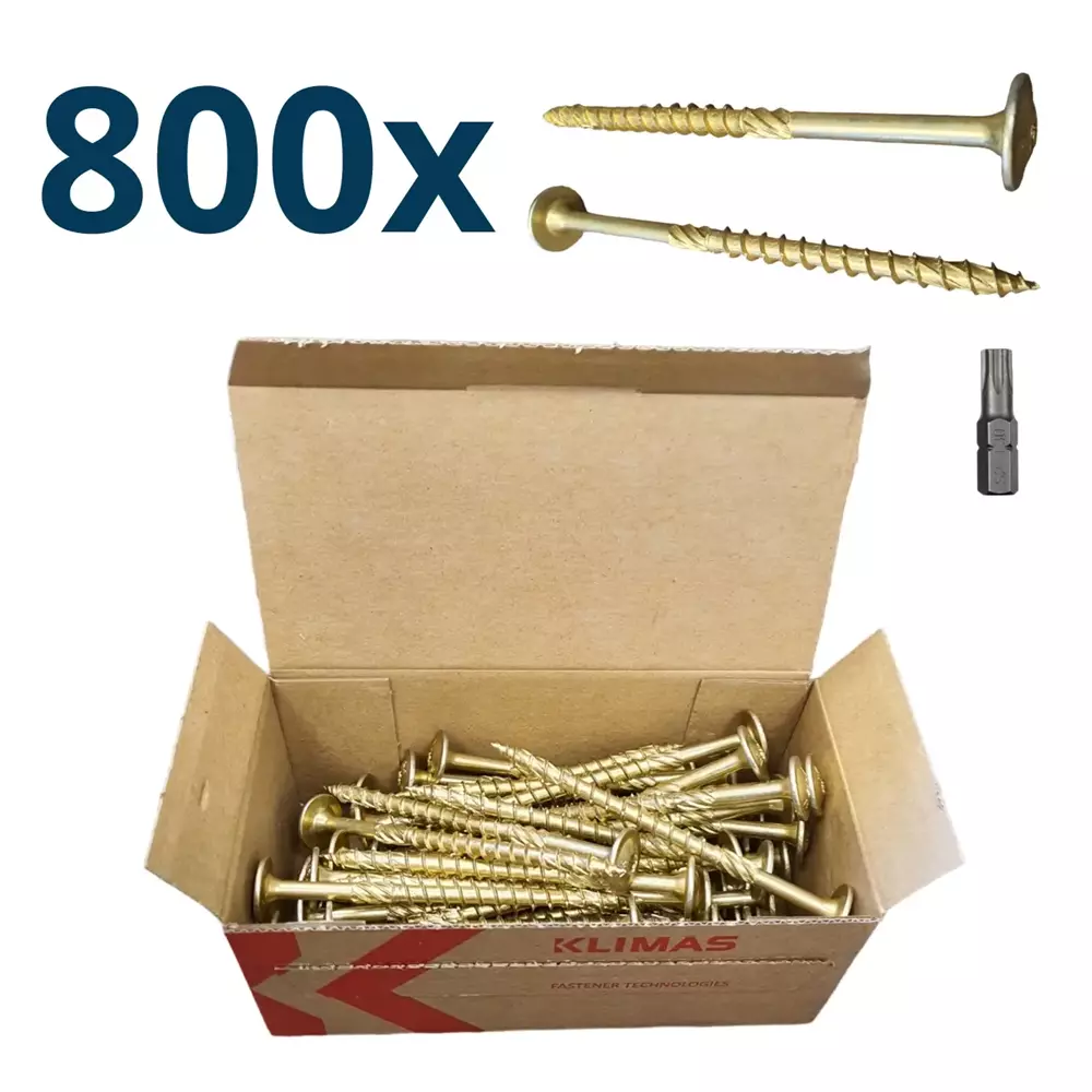 Wkręty ciesielskie Klimas Wkręt-Met to idealne narzędzia do łączenia elementów drewnianych, takich jak drewno lite, klejone, X-LAM, LVL i płyty drewnopochodne. Wykonane z niskowęglowej stali ocynkowanej galwanicznie, wkręt nie wymaga wcześniejszego nawiercania, dzięki czemu montaż jest szybszy i łatwiejszy, a zużycie energii jest ograniczone. Specjalna powłoka woskowa nanoszona podczas procesu produkcji zmniejsza moment wkręcania, co jest szczególnie korzystne dla narzędzi zasilanych akumulatorem.