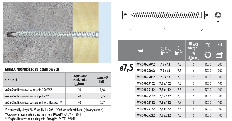 - Wymiary wkręta / śruby / trzpienia dw x Lw [mm] 7,5 x 182