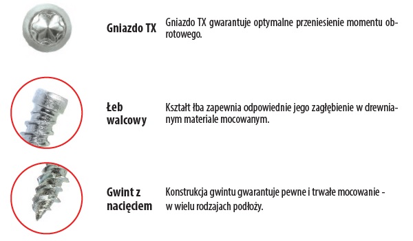 - Podwójne uzwojenie gwintu w części wkręcanej w podłoże powoduje doskonałe wyprowadzenie wkręta i odpowiednie odprowadzenie urobku