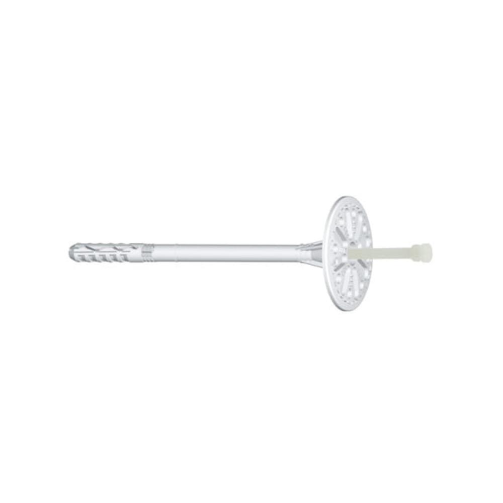 Uniwersalny łącznik do mocowania styropianu. Dzięki nowej konstrukcji strefy rozpierania łącznik może być montowany we wszystkich kategoriach podłoży z zachowaniem wysokich parametrów wytrzymałościowych! Specjalny trzpień tworzywowy wzmocniony włóknem szklanym. Krótka strefa rozporowa. Konstrukcja główka trzpienia ułatwia montaż, uszczelnia połączenie trzpień koszulka łącznika. Zwiększona ilość „kieszeni” klejowych na kołnierzu dociskowym umożliwia lepszą przyczepność zaprawy klejowej. Konstrukcja koszulki zwiększa sztywność kołnierza dociskowego.