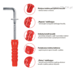 Hak stalowy ocynkowany do zamocowań lekkich elementów wykończeń wnętrz i lekkich elementów instalacyjnych – koszulka kołka wykonana z nylonu.