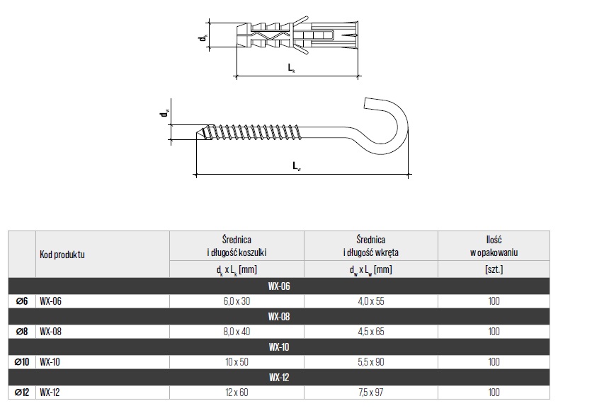 Kołki do podłoży pełnych 6x30mm z hakiem półpełnym WX-06 100szt