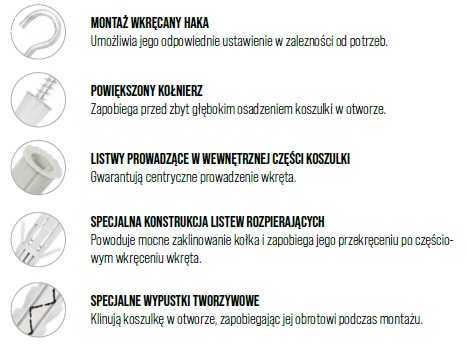 - Specjalna konstrukcja listew rozpierających powoduje mocne zaklinowanie kołka i zapobiega jego przekręceniu po częściowym wkręceniu wkręta