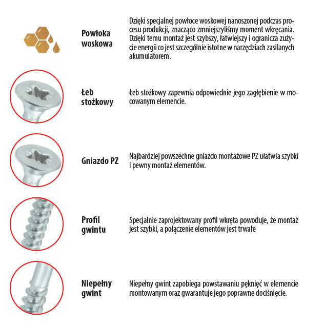 - Powłoka woskowa – dzięki specjalnej powłoce woskowej nanoszonej podczas procesu produkcji znacząco zmniejszono moment wkręcania. Dzięki temu montaż jest szybszy, łatwiejszy i ogranicza zużycie energii, co jest szczególnie ważne w narzędziach zasilanych akumulatorem.